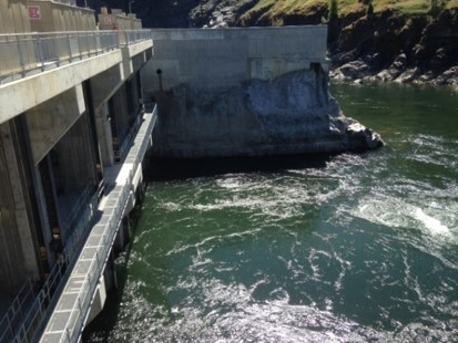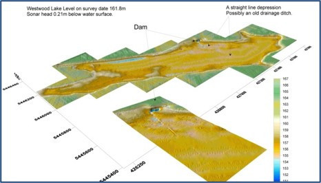 The  above image, shows a surface map of a dam area with sonar below water & laser data above