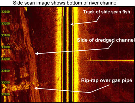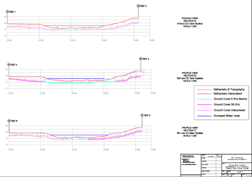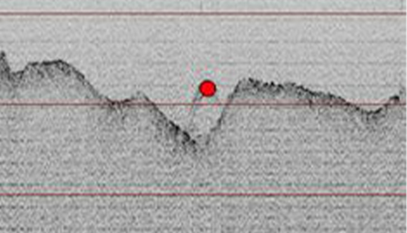 This image shows a bathymetric survey of a High Density Polyethylene Pipe river crossing. The sonar mainly shows the saddle weights and not the HDPE pipe itself.